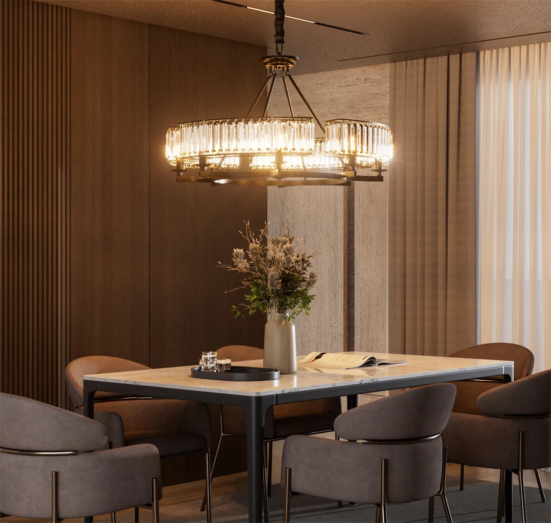 【Industrial Aesthetic】The pendant lighting fixture features a stunning circular metal frame with a matte black finish that serves as the foundation for the entire structure, and each elongated crystal hanging from the frame has been precision-cut to ensure mesmerizing reflection, creating a striking contrast that exuding an industrial aesthetic and luxurious flair, never go out of time, embodying both luxury and elegance.